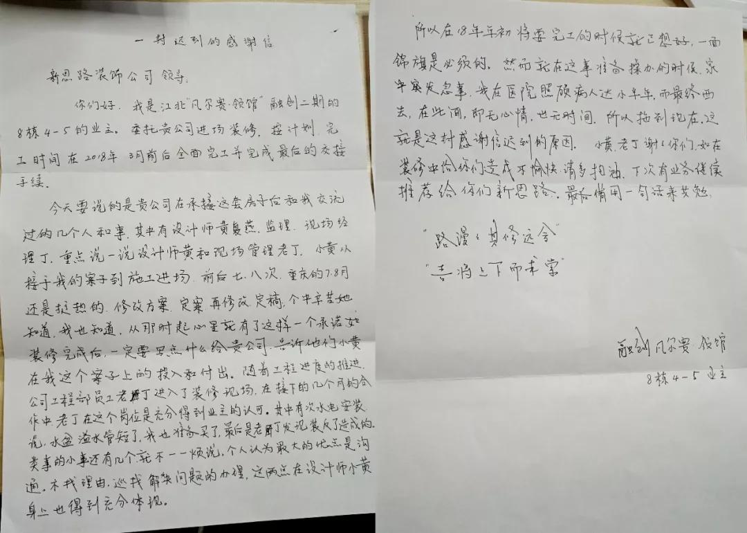 2019年1月18日,新思路裝飾收到了2019年的第一面錦旗與感謝信,來自江北融創(chuàng)凡爾賽·領(lǐng)館二期8棟的業(yè)主張老師專程來到南坪總部將一面印有“設(shè)計新穎,施工精良”的錦旗交給我們楊店長手中(張老師說這次來送錦旗也沒提前跟設(shè)計師和項目經(jīng)理說,知道他們也忙,就自己過來了。張老師實在是太貼心了),以感謝新思路裝飾高品質(zhì)工藝和優(yōu)質(zhì)貼心的服務(wù)。