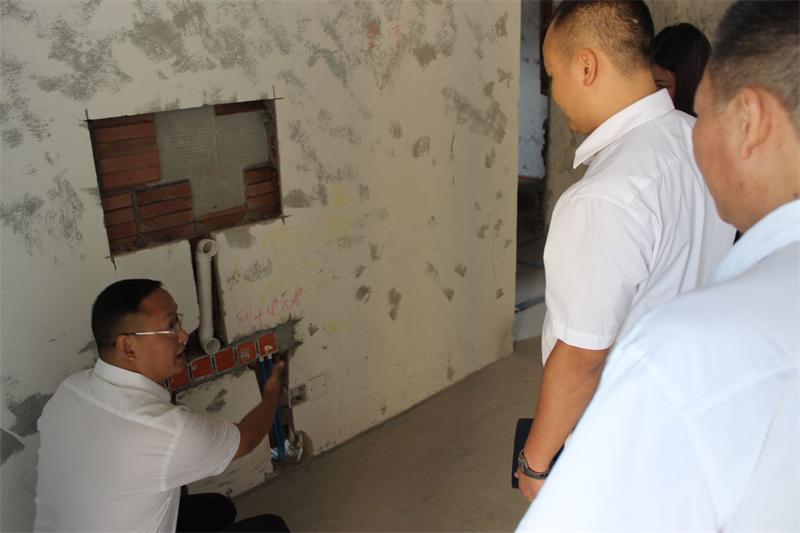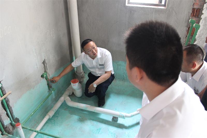 片區(qū)張經(jīng)理正在仔細(xì)檢查墻面貼磚情況