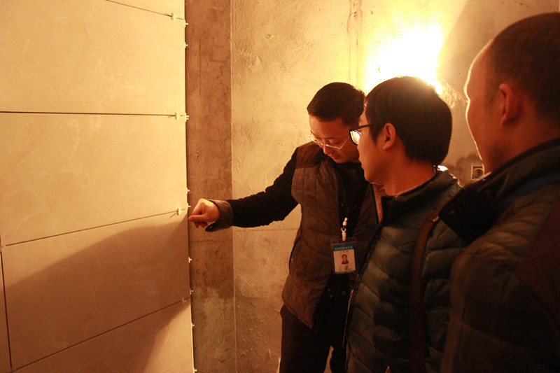 巡查小組正在仔細檢查墻面貼磚細節(jié)