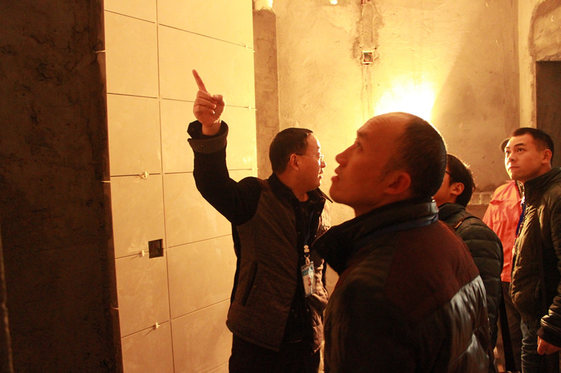 工程部文經(jīng)理正在向巡查小組成員講解墻面貼磚工藝要點