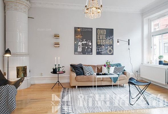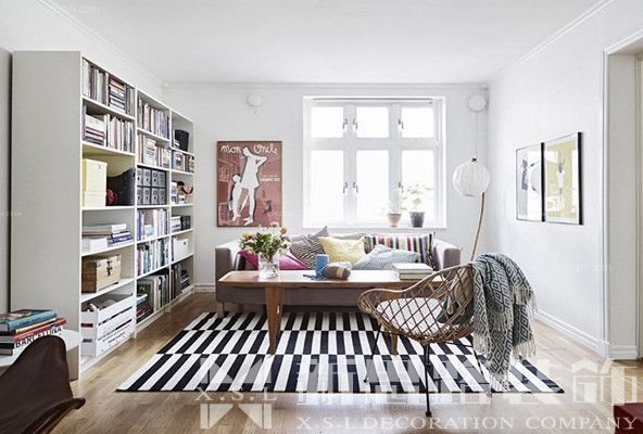 黑白兩色的搭配是配色中最常用的,同時也是北歐風格中經(jīng)常會使用到的顏色。以上面北歐風格沙發(fā)、一個藤條的躺椅使整個房間氣氛看起來輕松、自由,十分簡單的桌子設(shè)計和純白色家具的書架以及一個白色造型優(yōu)美的臺燈,讓人感覺整潔明亮。其中最亮眼的就當屬北歐客廳地毯的鋪設(shè),黑白條紋給人視覺上的交錯感,光看就感覺踩上去會很舒服,同時帶點小時尚感。